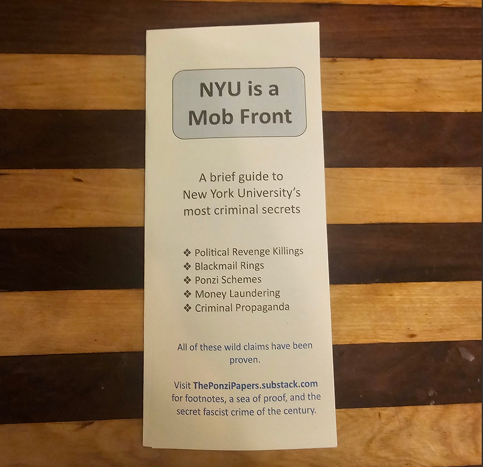 Investigate. If you look into high-tech NYU start-ups, you’ll find evidence of Ponzi schemes. If you look into NYU’s big donors, you’ll find ties to cryptocurrency. If you look into dead students, you’ll find evidence of murders and cover-ups. That is because this understanding of the world has remarkable explanatory power. That’s because it is true.
